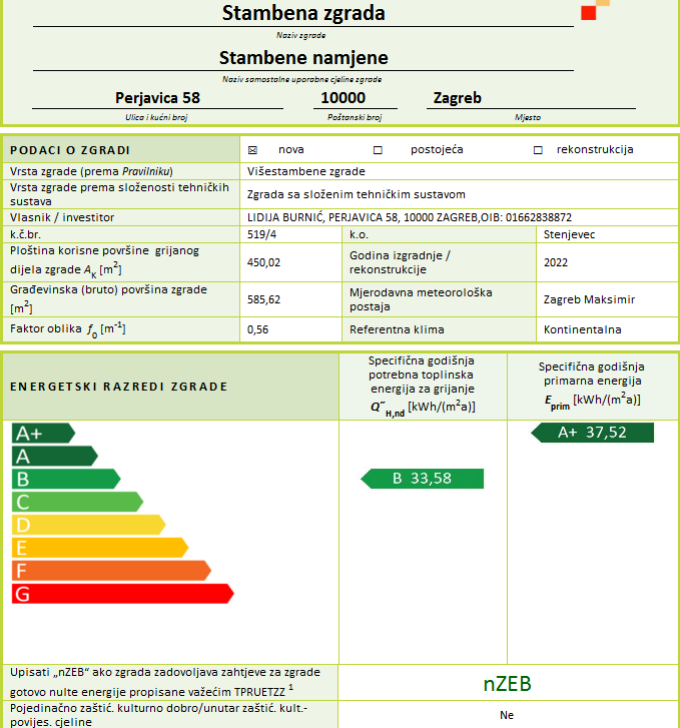 Podaci o potrošnji energije i energetskom razredu za cijelu zgradu kao cjelinu, na adresi Perjavica 58, 10000 Zagreb, č.č. 519/4, k.o. Stenjevec. Previđeno grijanje i hlađenje dizalicama topline zrak-voda, koje su predviđene i pripremljene za PTV.