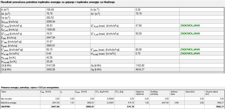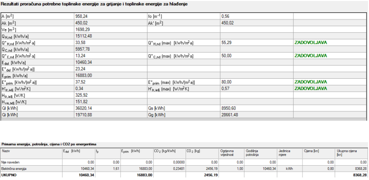 Što se tiče potrošnje energije za grijanje, hlađenje i PTV uz zadovoljavanje suvremenih standarda za NZEB zgrade, dobivena potrošnja za grijanje, hlađenje i PTV za zgradu iznosi 8368,28 kn godišnje (EU 1110,66), a onečišćenje CO2 iznosi 2456,19 kg. NZEB norma za novogradnje zahtijeva da minimalno 30% godišnje isporučene energije za rad tehničkih sustava u zgradi bude zadovoljeno energijom iz obnovljivih izvora energije, u slučaju zgrade kao cjeline, prema tehničkoj proračuna ostvareno je 65,63%.